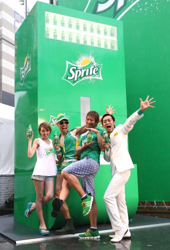 同所には高さ約4メートルの巨大なスプライト「スプラッシュ自販機」が出現。今年3月から始まった「つきぬけ爽快!スプライト」キャンペーンの一環で、南は突然見舞われた大雨の中、一発屋芸人によるユニット「再生可能ボーイズ」のレイザーラモンHG(37)、楽しんご(34)、ムーディ勝山(33)とともに巨大自販機の前に登場。スプラッシュ自販機のボタンを押すと、約4メートルの高さからスプライトが落下。取り出し口にたまっている水が派手にスプラッシュし、その水しぶきをかぶった4人はスプライトのような気持ちのいい「つきぬけ爽快」感を味わった。