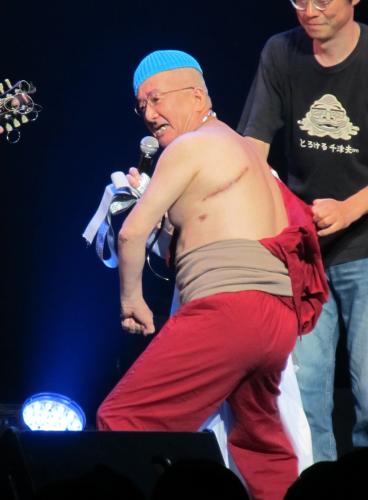 シンガー・ソングライターの北脇貴士(40)や中村有志(57)らとステージに登場。上半身裸になり背中の約15センチの手術痕を見せ、「ゴムパッチン」の芸も披露。中村から「安静にしてろって医師に言われただろ」と突っ込まれると、「若い女の子がいっぱいいるから」と会場を沸かせた。出演後、「舞台は最高。やっぱりウケるとうれしい。ここで死んでもいい」と笑顔。