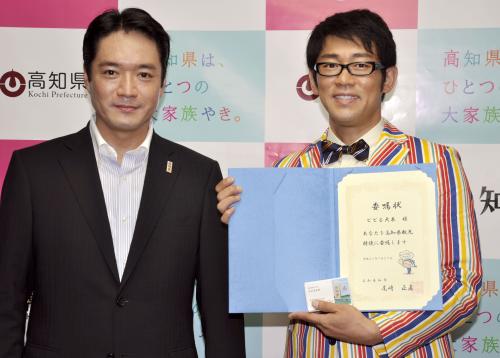 坂本龍馬らを輩出した高知県は27日、幕末の歴史好きで知られるタレントのビビる大木(38)を県観光特使に任命し、尾崎正直知事が県庁で委嘱状などを手渡した。任期は2015年3月末まで。