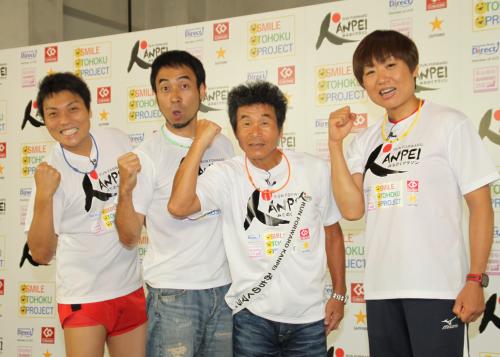 昨年は462キロを一人で走破した寛平だが、今年は総監督となり、寛平のほか、吉本芸人や3県に縁のあるタレントなどがタスキをつなぐ駅伝方式で、岩手県山田町からゴールの福島県いわき市までの480キロを9日間で走ることになる。会見には、寛平のほか、同マラソンに参加するお笑いコンビ「南海キャンディーズ」のしずちゃん(34)、「ペナルティ」のワッキー(41)、「サバンナ」の八木真澄(38)らが出席した。