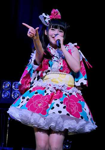 今年4月24日発売のデビュー・シングル「七つの海よりキミの海」と同カップリング曲「我旗の元へと集いたまえ」を歌った後、客席の半分以上が赤いTシャツ姿のファンたちを見て「見渡す限り血の海ですよねえ。セットも墓場のイメージというか、手首がここにありますし、花も食べ物も備えてあり、完璧ですよ。何はともあれ、皆さま、本日はお越しいただき誠にありがとうございます」と笑顔であいさつ。新曲「げんし、女子は、たいようだった。」や同カップリング曲「テトリアシトリ」、「アゲアゲ スミダ」など全11曲を熱唱。