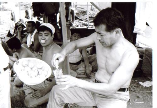 1967年 映画「黒部の太陽」撮影中の貴重な初公開写真。暑さの中の撮影で、三船敏郎さん(右手前)が石原裕次郎(中央)ら共演者やスタッフに栄養補給のレモンを自ら搾りふるまう。(C)石原プロモーション