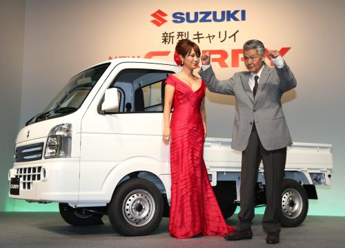 俳優菅原文太(80)とタレントはるな愛(41)がスズキの軽トラック「新型キャリイ」のCMキャラクターに起用され、発表会が29日、都内で行われた。14年ぶりにフルモデルチェンジした「キャリイ」は9月20日に発売開始。2人は同17日から全国放送予定の新CM「軽トラ野郎」編で初共演している。