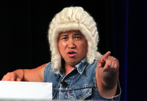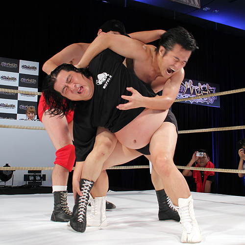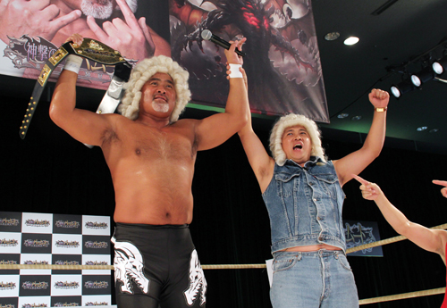 モバゲー「神撃のバハムート」2周年記念スペシャルマッチ バハムート級王座決定戦で長州小力をクラッシングエルボを決めて、ホールするも、はずみでかつらがはずれ慌てる武藤敬司