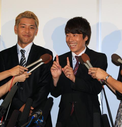番組終了後に笑顔で会見する田村淳(右)左は相方の田村亮