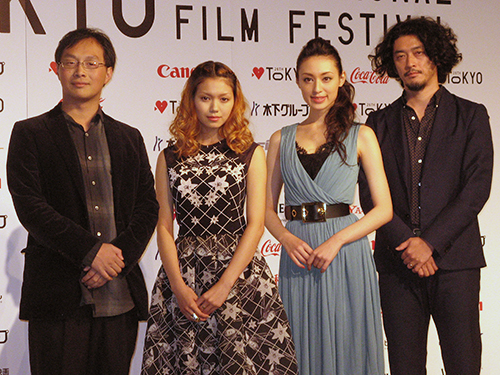 東京国際映画祭の記者会見に出席した(左から)深田晃司監督、二階堂ふみ、栗山千明、榊英雄監督