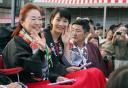 大阪市内でトークイベントを開いた「少女時代」のスヨン(左)とヒョヨン(左から3人目)ら