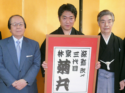 菊丸は明治時代に活躍した落語家で、今回が約115年ぶりの名跡復活。染弥は「師匠に弟子入りして来年で20年。本当の父親のように育ててもらいました。襲名は落語家としての成人式のつもり。ご恩は“倍返し”したい」と、大ヒットドラマ「半沢直樹」の決めぜりふで誓った。