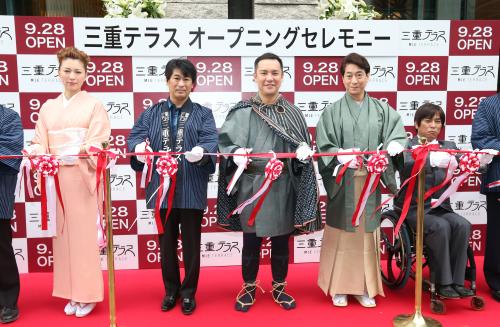 歌舞伎俳優中村福助(52)、バドミントン元日本代表小椋久美子さん(30)、元プロ車いすランナー伊藤智也さん(50)が28日、東京・日本橋に開設された三重県の首都圏営業拠点「三重テラス」のオープニングセレモニーに参加した。テープカットを行った3人は「日本橋と三重」をテーマに鈴木英敬知事(39)とトークも繰り広げた。