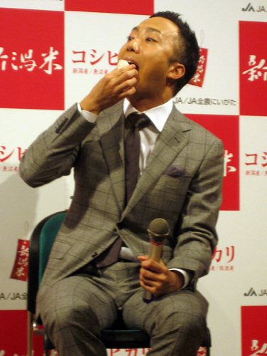 四代目襲名公演中の猿之助は自らとブランド米のコシヒカリを重ね「私も中身があるブランドをいつも心がけています」と語り、来月、襲名公演のフィナーレを京都で努めることに触れ「いきつけの京都の料亭すべてにコシヒカリを勧めます」としっかりPRした。