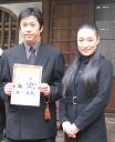 湯川れい子審査員長から祝福されるグランドチャンピオンの山下純一さん(中央)