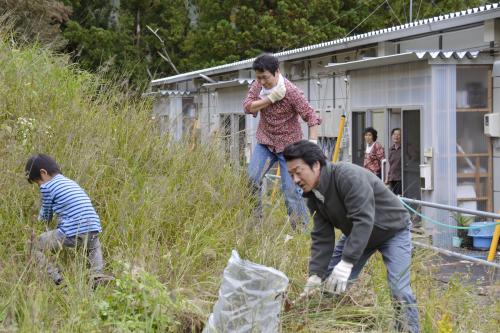 東日本大震災で被災した宮城県石巻市を主な舞台に、NHK仙台放送局が制作中のドラマ「かつお」のロケが21日、同市の折浜仮設住宅であり、主人公の元漁師役の大友康平(57)=同県塩釜市出身=が草を刈る場面や、元漁師の前に現れるボランティア役の芦名星(29)=福島県郡山市出身=が子供らと会話を交わす場面などが撮影された。