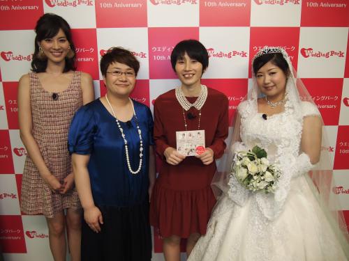 結婚準備クチコミ情報サイト「ウエディングパーク」10周年記念番組収録に臨んだ(左から)司会の安座間美優、ゲストのハリセンボン・近藤春菜、箕輪はるか、アジアン・馬場園梓