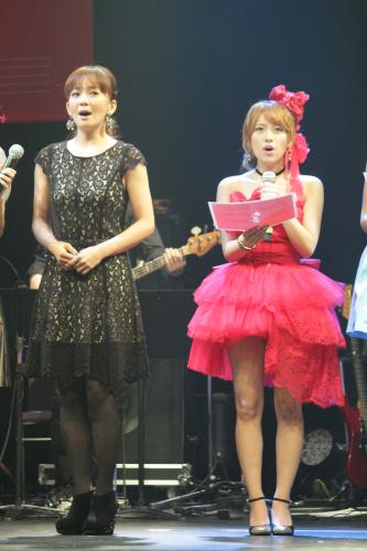 「2013 LIVE FOR LIFE『音楽彩』~本田美奈子メモリアル~」の公演前、アメージング・グレースを歌う華原朋美(左)と高橋みなみ
