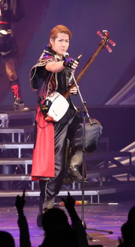 洋楽をバックに伝統舞踊を踊る新感覚のステージが魅力で、歌手としても活動。この日は歌手の長山洋子(45)からプレゼントされたという三味線の胴掛けを披露し、新曲「じょんからロック」を熱演。「初日でしたが、楽しんでやれました。花園の世界観を多くの方に見てもらいたい」と話した。
