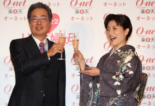 「いい夫婦 パートナー・オブ・ザ・イヤー2013」記者発表会に出席し、シャンパンで結婚30周年を祝う大和田獏・岡江久美子夫妻