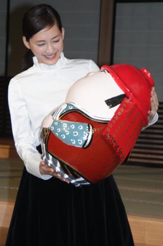 NHK大河ドラマバトンタッチ会で、黒田官兵衛を模しただるまに笑みがこぼれる綾瀬はるか