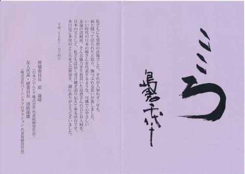 会葬礼状に島倉さん直筆「こころ」の文字