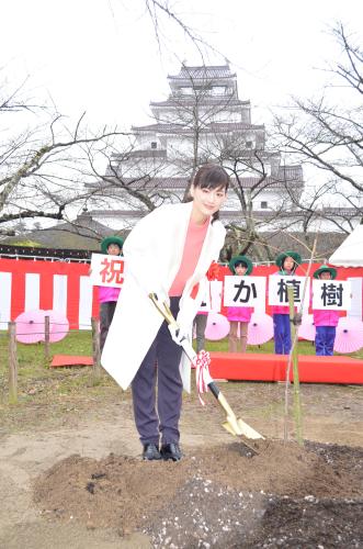 会津若松市の鶴ケ城内で、新種の桜「はるか」を植樹セレモニーに出席した綾瀬はるか