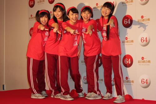 2回目の出場となる「ももいろクローバーZ」は昨年同様に赤いTシャツにハチマキの運動会ファッションで登場。カメラマンが待ち構える花道をダッシュで駆け抜け、Tシャツにも書かれた「通過点」を強調した。
