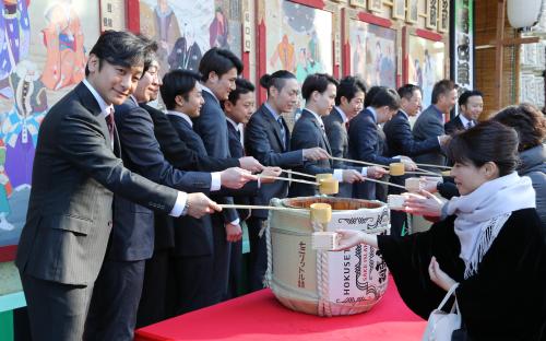 歌舞伎俳優の片岡愛之助(41)らが2日、東京・浅草公会堂で「新春浅草歌舞伎」の初日公演前に鏡抜きを行った。