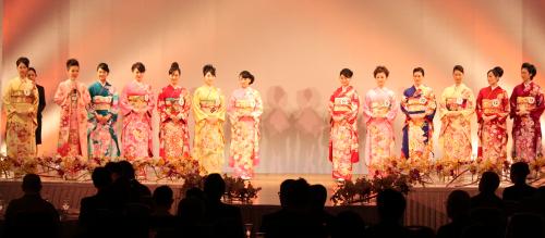 「第46回ミス日本グランプリ決定コンテスト2014」決勝コンテストの着物審査のステージに立つミス13人の日本候補者たち