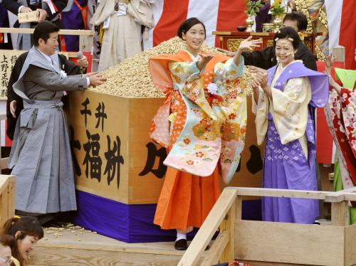 「福は内」の掛け声とともに杏らが豆をまくと、境内に集まった参拝客は、歓声を上げながら、紙袋を頭上に掲げ受け止めた。
