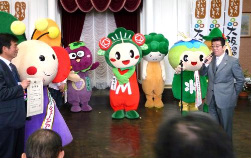知事は、フルルの大使就任祝いに駆け付けた府内の自治体などのゆるキャラ10体に対しても「いっぱいいるが、ふなっしーに勝てない」と一喝した。