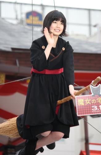 主人公の魔女・キキを演じた小芝は、劇中同様、ほうきにまたがり、劇中衣装で上空高く15メートルのフライングを披露。この日のイベントのために、小芝には傷害保険1億円をかけられており、決死の初主演映画PRとなった。