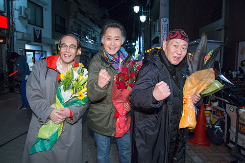 最後の撮影は作者の有川さんが見守る中行われ、「三匹のおっさん」を演じる北大路欣也(70)泉谷しげる(65)志賀廣太郎(65)が見事なチームワークで真冬のロケを乗り切った。