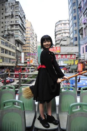 小芝は魔女の衣装にほうきを持った劇中そのままの格好で、香港屈指の繁華街である九龍地区の弥敦道(ネイザンロード)に登場。名物の2階建てバスで街中を巡ると、道を歩く人は驚きの表情。「この格好で外に出るのは日本では恥ずかしいけど、外国だと平気」と笑顔で満喫した。