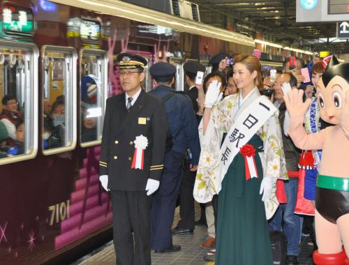 緑色のはかまに花柄の着物姿で現れた芹香は、一日駅長の任命式で「100周年を迎えた歌劇団の記念列車ができてうれしく思います」とあいさつ。出発式後には、訪れた多くの歌劇ファンや鉄道ファンに、にこやかに手を振っていた。