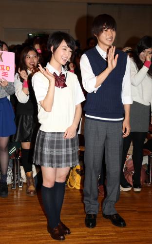 共演の山崎賢人(19)と、劇中で着た高校生の制服姿で登場。「コスプレになってしまうので恥ずかしいけど、何歳まで着られるか試してみたい」と話した。