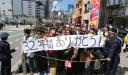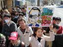 フジテレビ「笑っていいとも」最終回を迎える新宿・アルタ前で、タモリへのメッセージとイラストが書かれたボードを掲げるファン