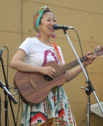 「春が来ましたね。野外も気持ちいいですね」と笑顔で話し、笠置シヅ子さんのカバー曲「買い物ブギ」など9曲を披露。広島県出身で、昨年11月に同曲の自主制作盤がCD発売されてから注目されてきた。明るい性格と、グルーブ感あふれる伸びやかな歌声が売り。「商店街が大好き。いろんな商店街でライブをして活気づけたい」と張り切っている。