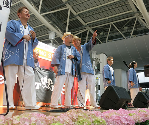 ミニライブ中に談笑するイトキン(左から3人目)とTENN(同2人目)