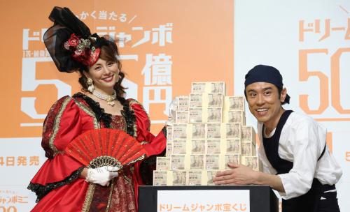 女優の米倉涼子(38)とネプチューンの原田泰造(44)が8日、都内で「ジャンボ宝くじ」の新CM発表会を行った。