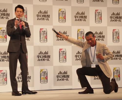 「アサヒ 辛口焼酎ハイボール」新CM記者発表会で、唐沢寿明(左)にひざまずいてマイクを向ける柳葉敏郎