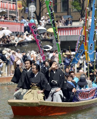 初夏のような強い日差しの下、役者13人と市民らを乗せた10隻の小舟が、にぎやかなおはやしの音色とともに約800メートルをゆっくりと下った。白い紙吹雪が舞う中、役者は観客からの声援に手を振って応えた。