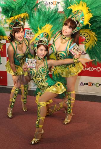 サッカーW杯ブラジル大会を盛り上げようと結成された巨乳3人組「おっPサンバ」が4日、都内でデビュー曲「Wカップ!」の発売記念イベントを行った。