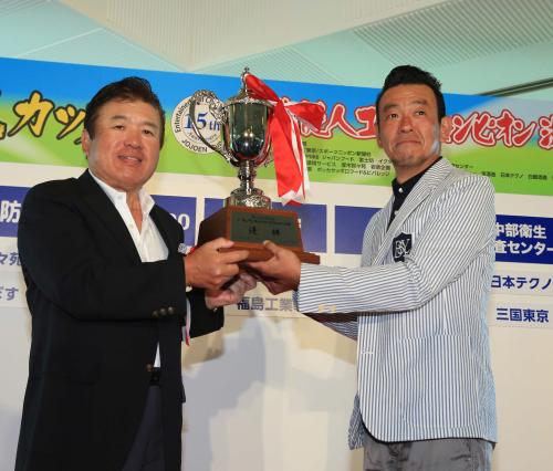優勝した清水圭(右)は新井泰道大会会長からカップを受け取る