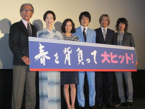 映画「春を背負って」の初日舞台あいさつに登壇した(左から)木村大作監督、檀ふみ、蒼井優、松山ケンイチ、豊川悦司、新井浩文
