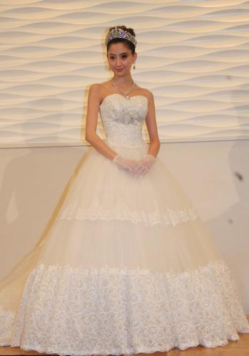 真っ白なドレスをまとい、銀座ダイヤモンドシライシのオリジナルティアラなど時価7億円相当のアクセサリー(総カラット数200カラット)を身につけて登場。