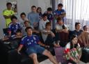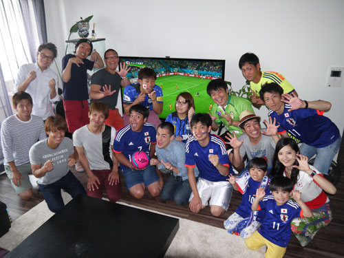自宅で日本戦を観戦するたむらけんじ(前列左から4人目)らTKF、ハーフタイムまでは元気いっぱいだったが…
