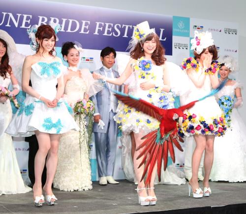 <2014乃木坂JUNE BRIDEフェスティバル>ウエディング姿で記念撮影中の乃木坂46の(左から)松村沙友理、白石麻衣、橋本奈々未はベニコンゴウインコ「モリー」が急に逃げ出してビックリ