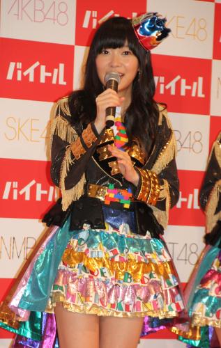 「バイトルAKB48グループとの契約発表会」が23日、都内で行われ、「AKB48」の渡辺麻友(20)、「HKT48」の指原莉乃(21)、「SKE48」の松井珠理奈(17)、「NMB48」の山本彩(20)らが出席。「腎のう胞」を発症し、当分治療に専念するため休養中の峯岸みなみ(21)についてコメントした。
