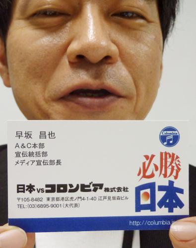 企業ロゴを「日本VSコロンビア」に変更した名刺を手にする日本コロムビアの広報担当者