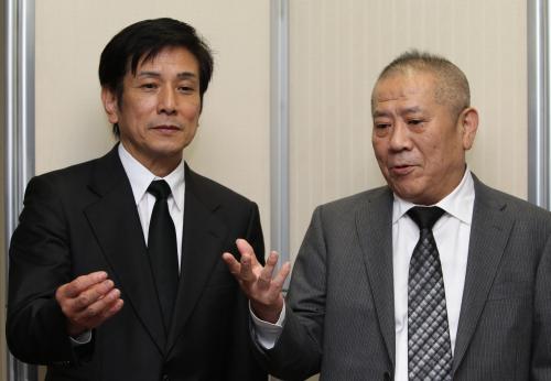 桂米朝夫人・中川絹子さんの思い出を語る桂米団治(左)と桂ざこば