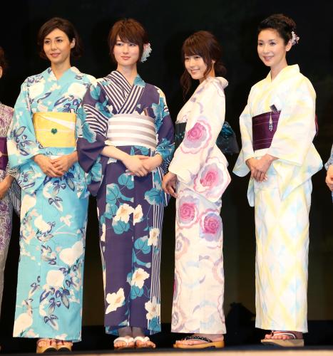 映画「思い出のマーニー」完成披露記者会見に浴衣姿で登場した(左から)松嶋菜々子、高月彩良、有村架純、黒木瞳