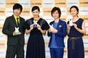 テレビ東京のドラマ「アオイホノオ」の制作発表に出席した(左から)福田雄一監督、安田顕、柳楽優弥、山本美月、ムロツヨシ、中村倫也